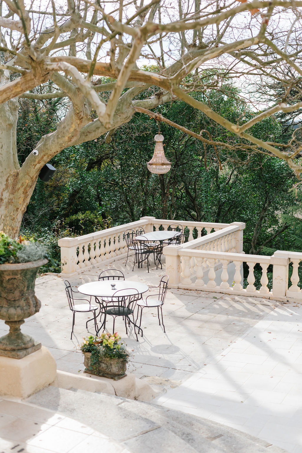 Les vastes terrasses, aménagées sur plusieurs niveaux, se déploient comme de véritables salons de verdure. Dès les beaux jours, elles deviennent un lieu de vie à part entière : un cadre apaisant où déjeuner ou dîner à l’ombre des arbres, bercé par la douceur du climat méditerranéen.